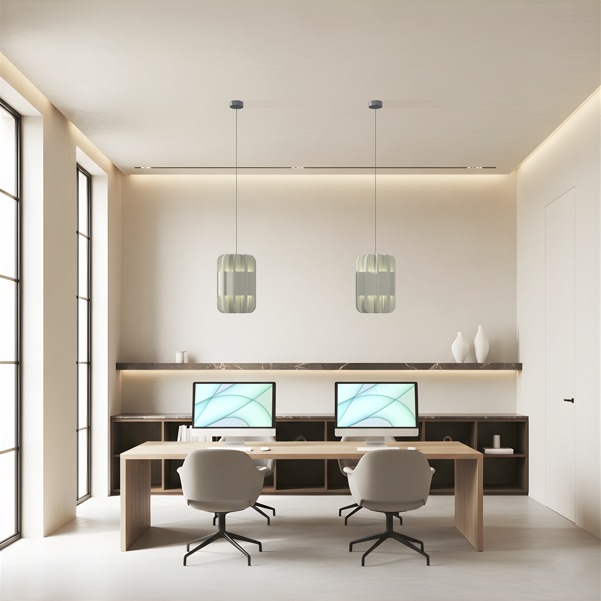 Mesphillia is een akoestische lamp die licht en geluidsabsorptie combineert. Het armatuur helpt galm te verminderen en voegt tegelijk een rustig element toe aan de ruimte. Te verkrijgen in 88 kleuren.