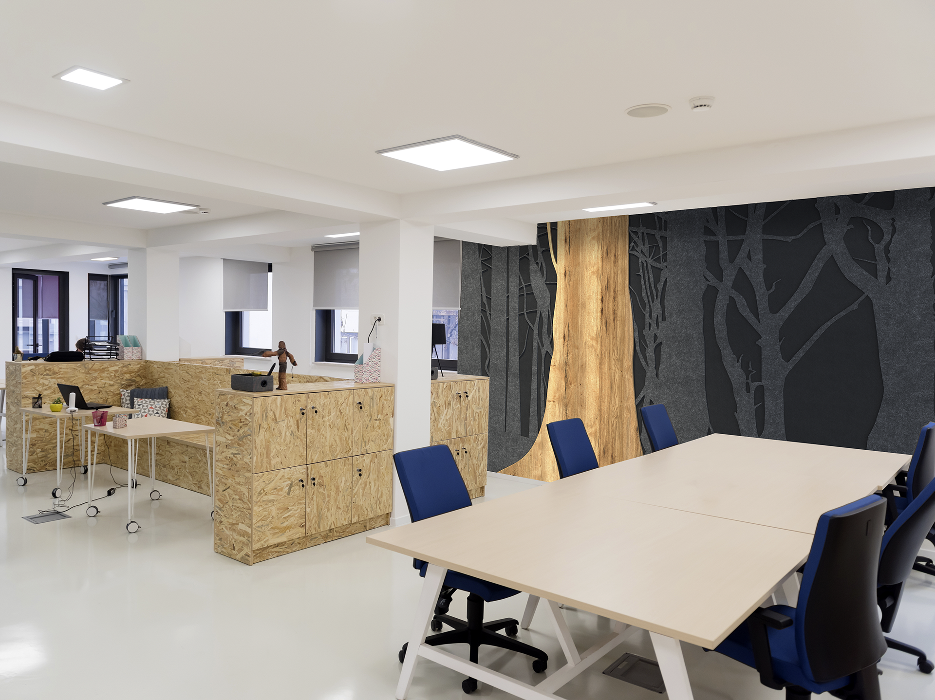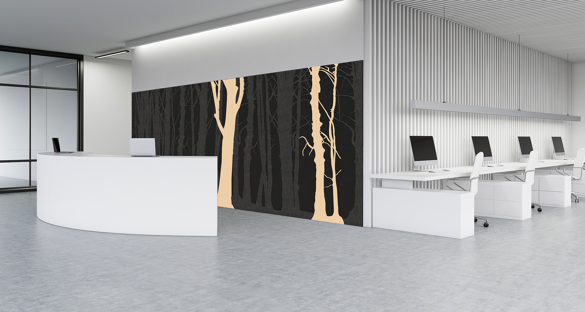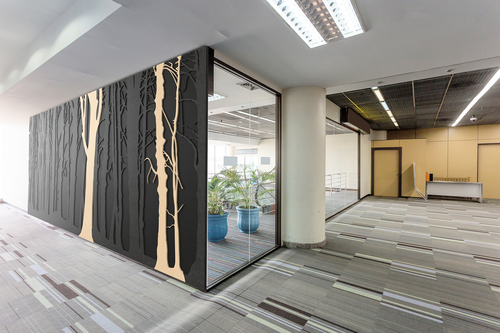 Een duurzaam, akoestisch bos gesneden uit PETFelt met 3D-effect. Dit akoestische materiaal kunnen wij in een patroon van drie verschillende soorten bos snijden. We snijden al deze details uit om een effect met geweldig mooie slagschaduwen te creëren. Zo toveren we in no-time een rustgevend, natuurlijk bos op de muren van jouw ruimte.