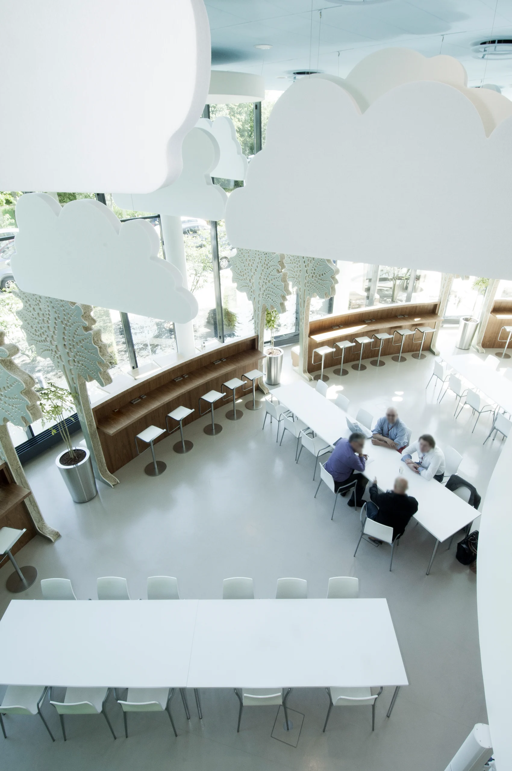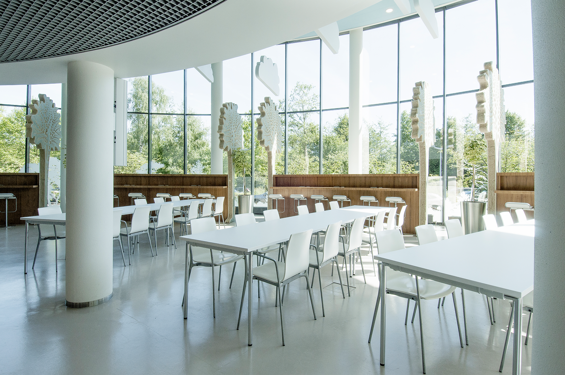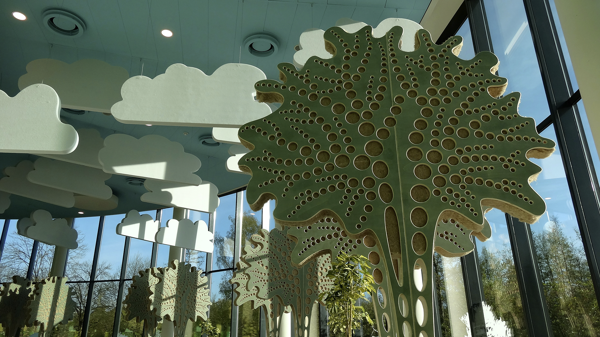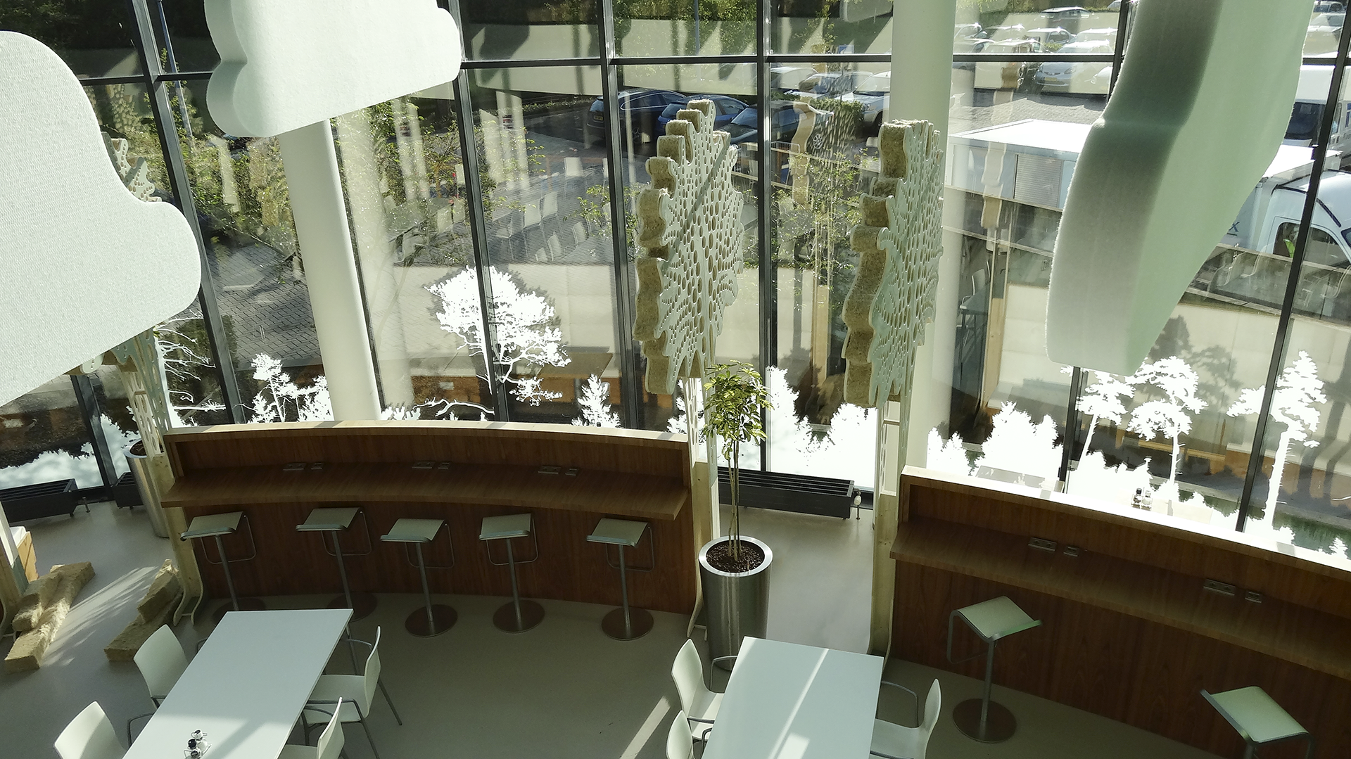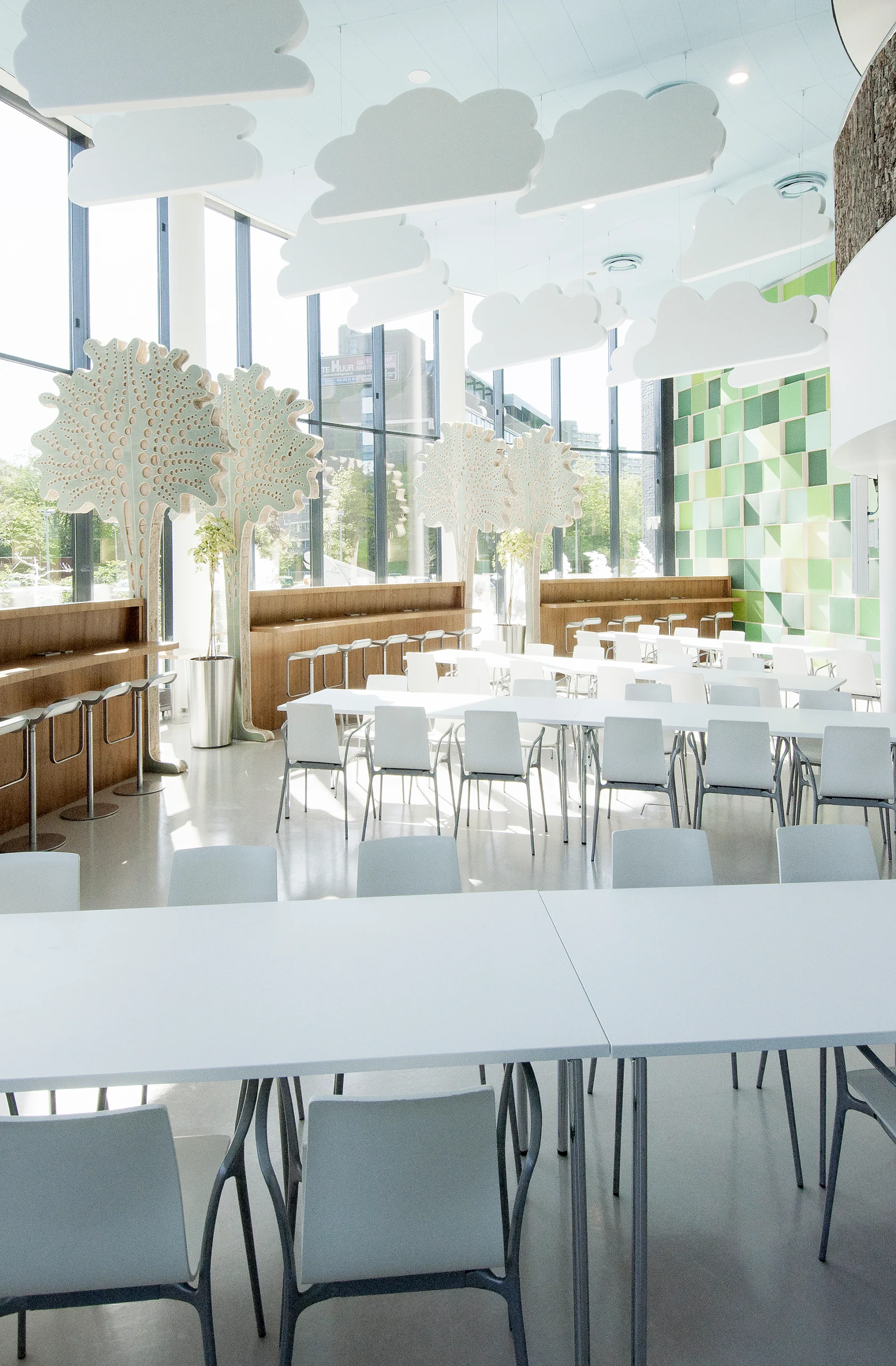 In dit bedrijfsrestaurant van de overheid hebben wij de vrije hand gehad om met Biophilic Design de akoestiek perfect te maken. Met akoestische wolken en grote bomen in natuurlijke kleuren en ook enkele standaard oplossingen een ‘wereld’ creëren waar men heerlijk kan ontspannen met een perfecte akoestiek.